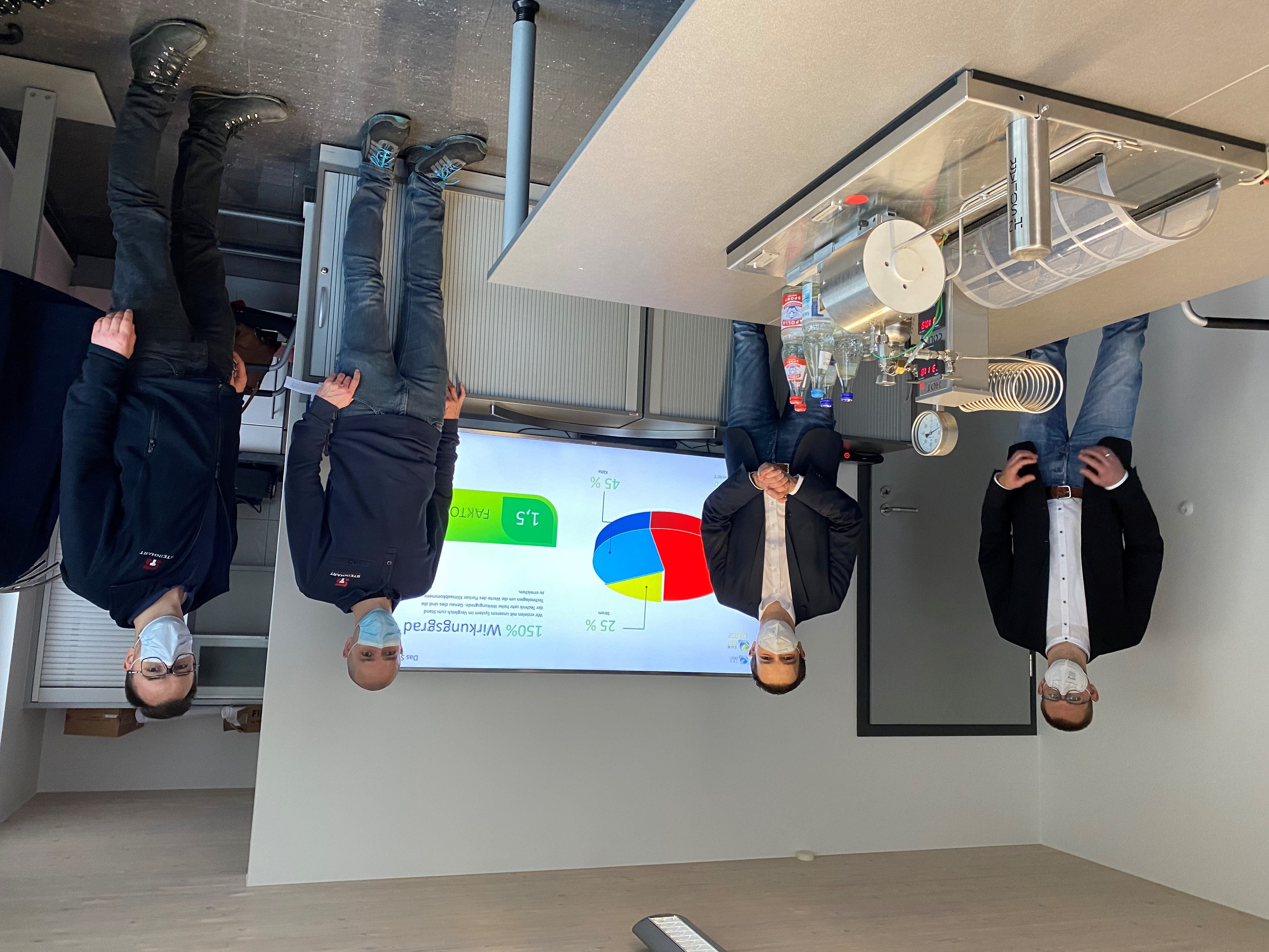 Geschäftsführer Frank Steinhart erklärte den Politikern die Funktionsweise des innovativen Produkts: „Durch die Koppelung zweier verschiedener Wasserstoff- bzw. H2-Systeme, dem reversiblen Speicherreaktor für den 24-Stunden-Betrieb und dem freien, elektrolytisch erzeugten H2 als Langzeitspeichermedium, können wir mit unserem System typischerweise ein Wohnhaus in Deutschland komplett energieautonom machen, ohne auf problematische elektrische Batterien zurückgreifen zu müssen.“